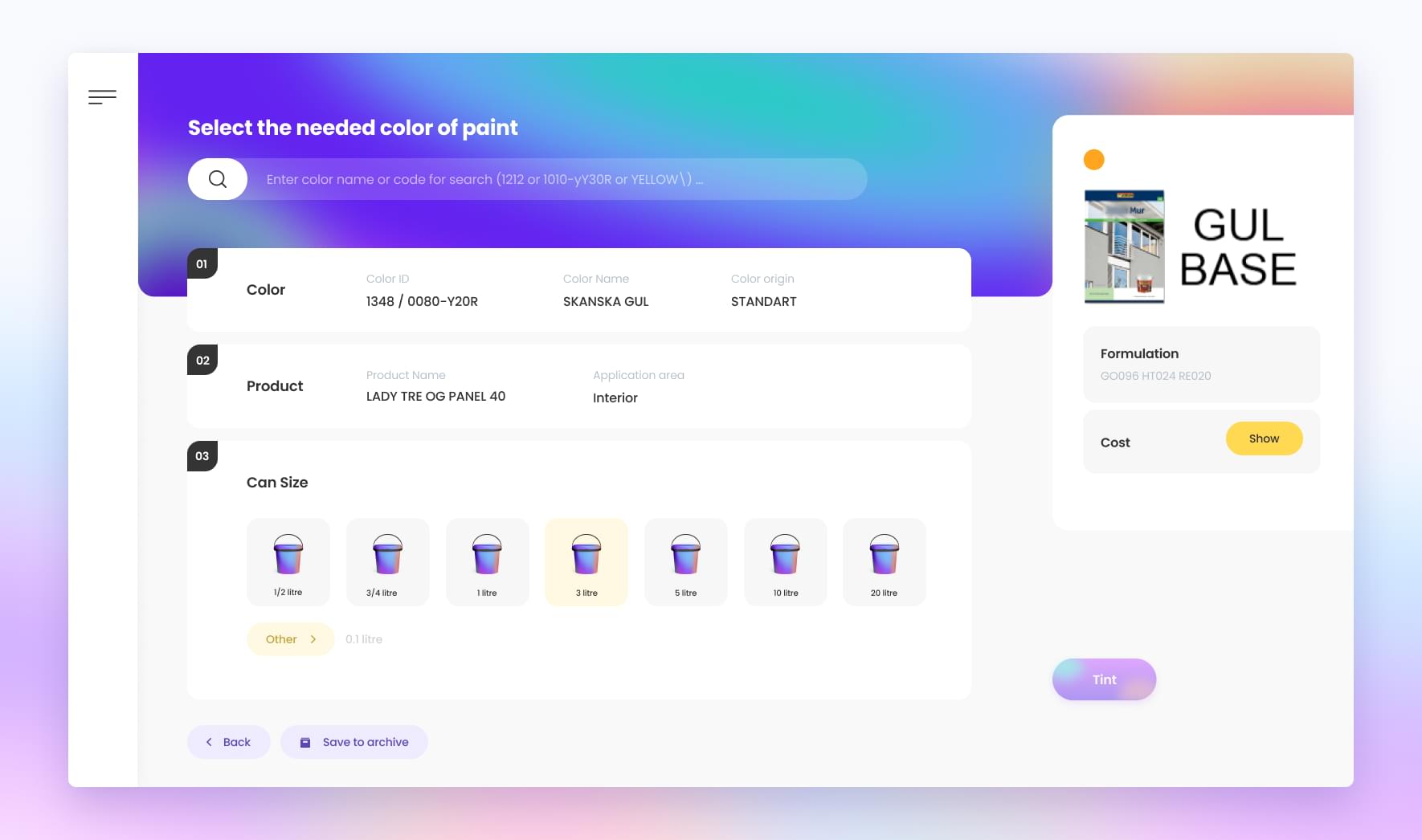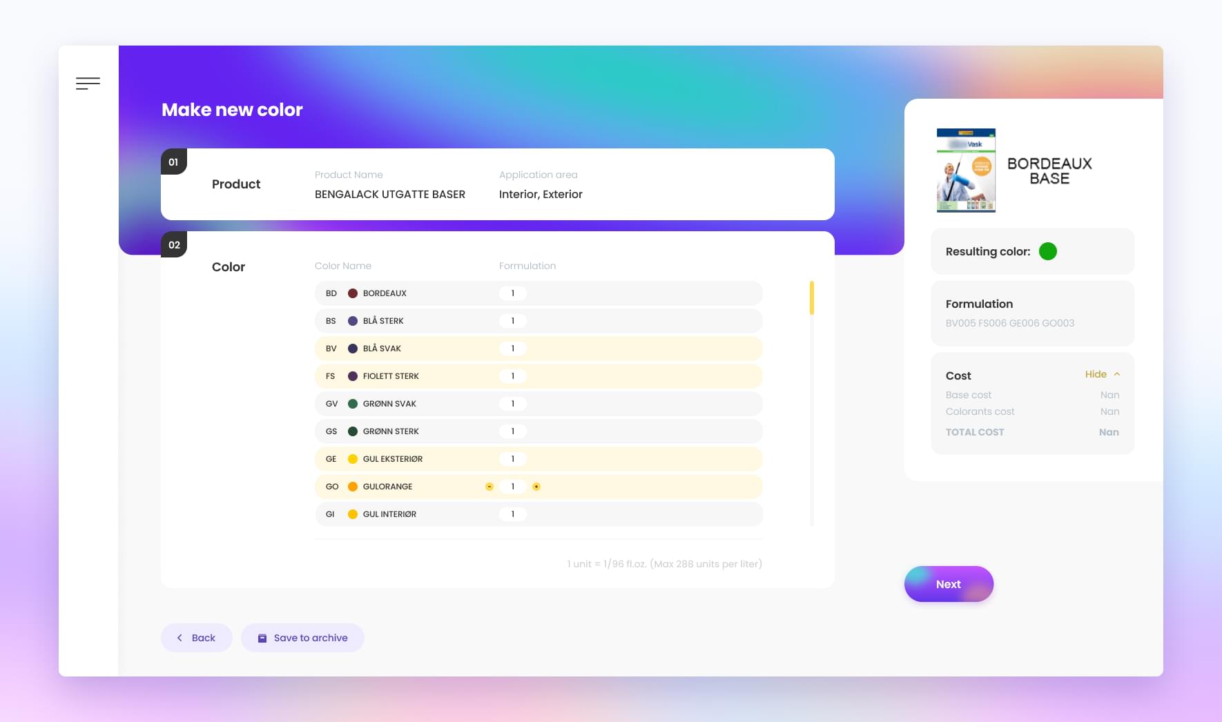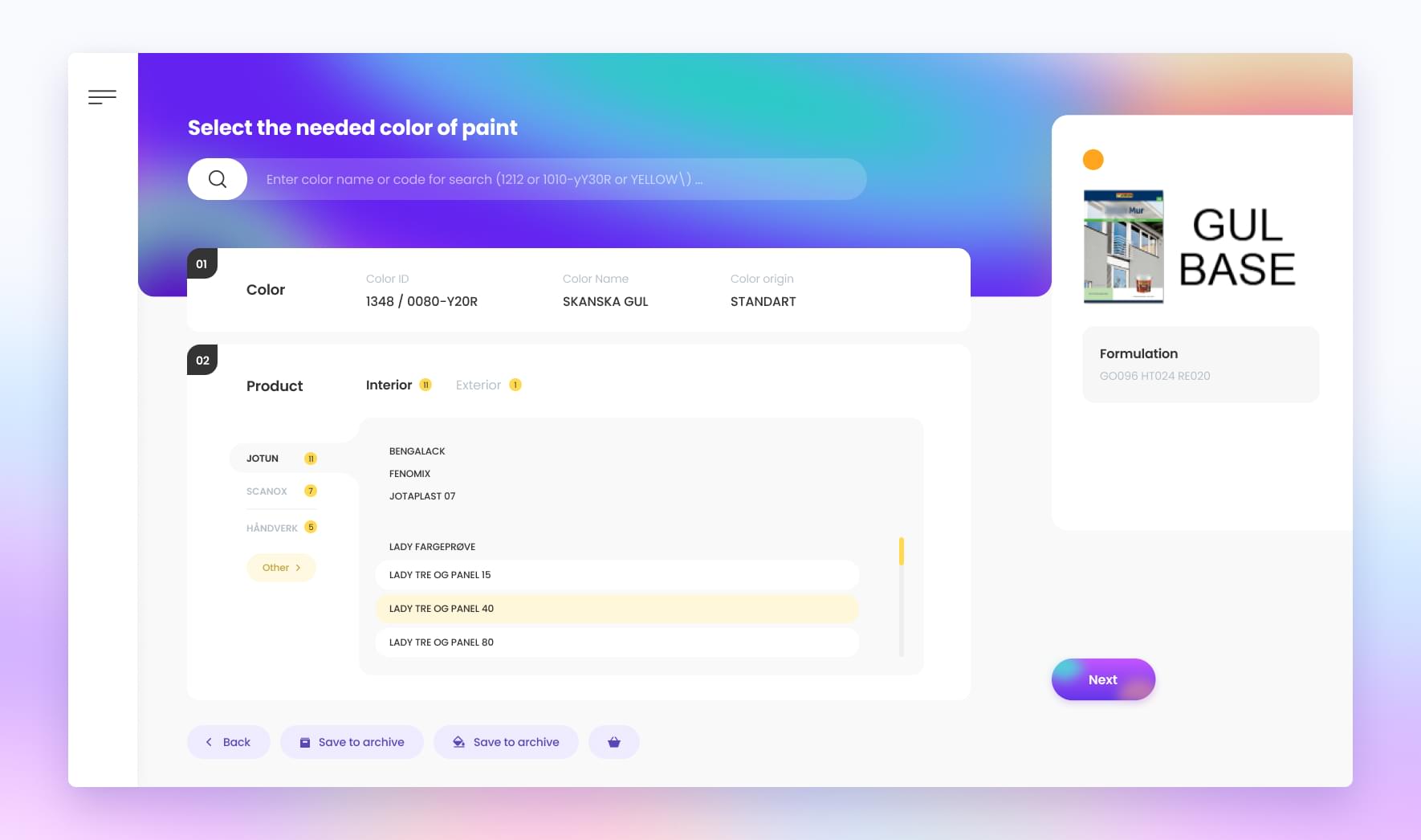 アプリケーションは、望みの色彩や品質を得るために塗料の選定や混合のプロセスで塗装工場のスタッフをサポートするよう設計されています。個々の顧客に合った塗料の色合いや質感を選ぶのに役立つツールを経営者に提供します。データは、望みの塗料の種類を得るために所要のカラーベースに比例して選定した着色料を混ぜ合わせる調色機へ送信されます。それとは別に、システムは特定カラーの現レシピも提示します。アプリケーションは、塗装工場が購入した塗料のレシピだけでなく顧客の情報も保存できます。顧客が同じカラーの塗料を必要とする場合、顧客名でデータベースに保存してあるレシピを使って簡単に混合することができます。